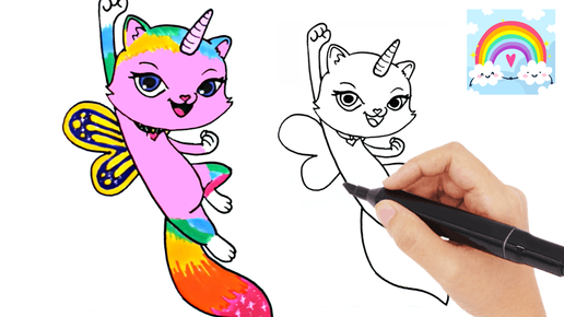 Как нарисовать Радужно-бабочково-единорожную кошку шаг за шагом | Простые уроки рисования ❤