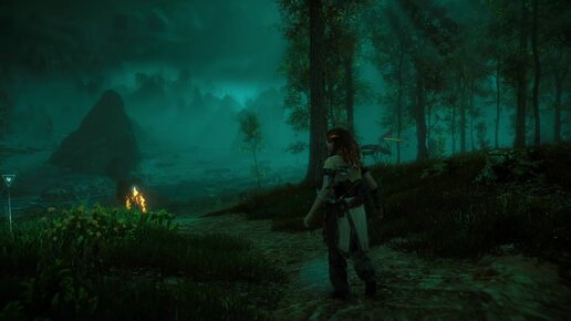 Костер у реки на краю виртуального леса