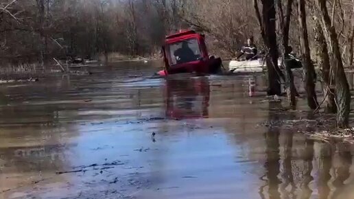 Трактор тащит ниву через реку, как на поводке. Преодоление брода на ниве