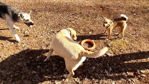 Какие разные собаки на собачьей площадке. Играют все вместе. И крупные, и мелкие