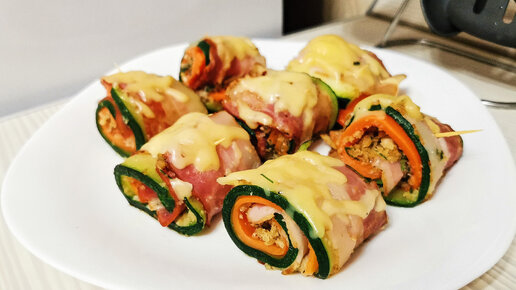 Рулетики с беконом и цуккини под сырной корочкой – рецепт простой горячей закуски