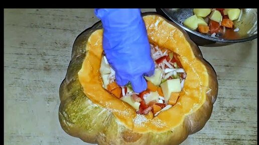 Запечённая тыква, внутри с овощами и с говядина тонкий край,куриные ножки.
