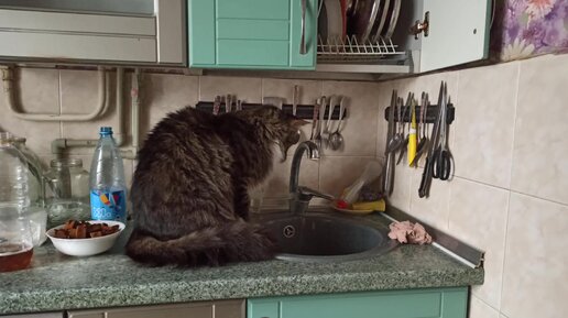 кот Мейн Кун ловит капли