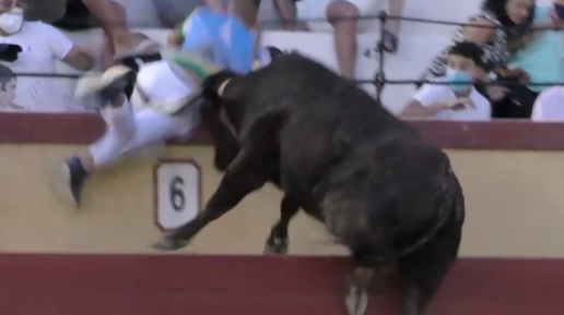 Бык все пытается перепрыгнуть через барьер к зрителям. И иногда у него это получается!