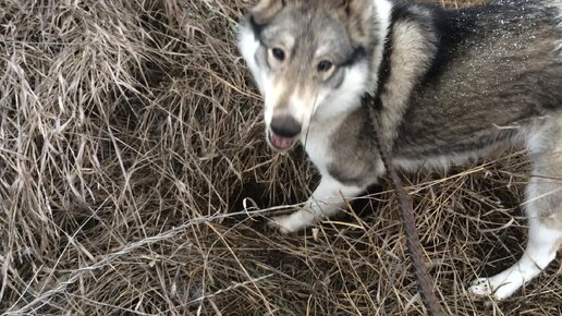 Собака Ника Роет нору на прогулке и играется с мячиком