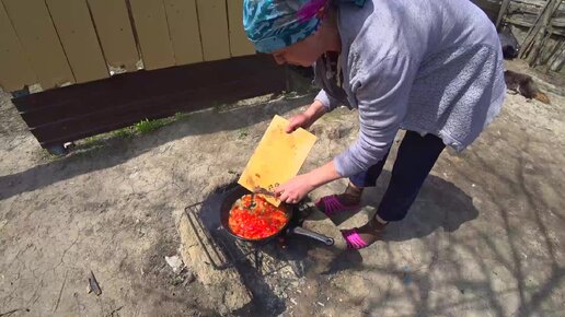 Делаем в деревне завтрак. Вареные яйца с тушенными помидорами на костре.