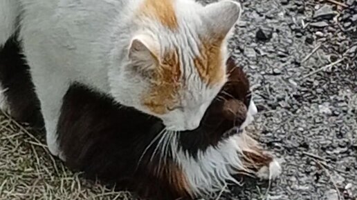 "Брачные игры" рыжеватого кота и черной(с белой грудкой) кошечки