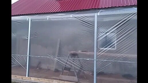 На улице ветер, а мы пленкой каркас теплицы к дому накрываем, как нам скотч помог в этом?