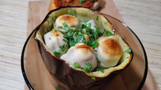 Пельмени в духовке в баклажанах, собственный рецепт, показываю приготовление