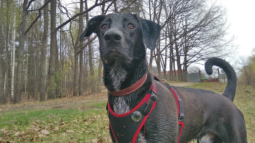 Метис курцхаара Рокки достает из воды бревно