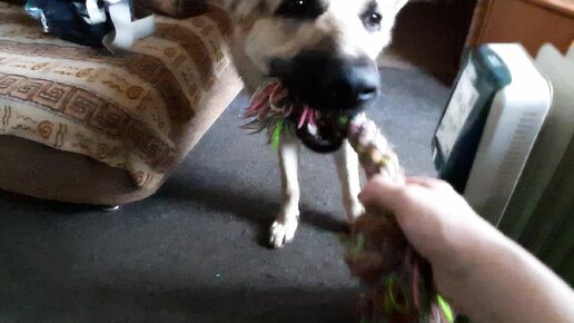 Собака пристает с игрой в косичку. Желает играть в перетягивание