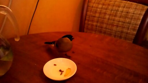 Снегири дома: одна ест, второй поёт