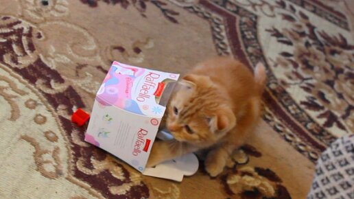 Котёнок Бася, коробка и красный кубик.