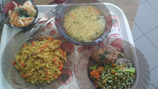 Кушаю в столовой:суп,плов и котлету с овощами.