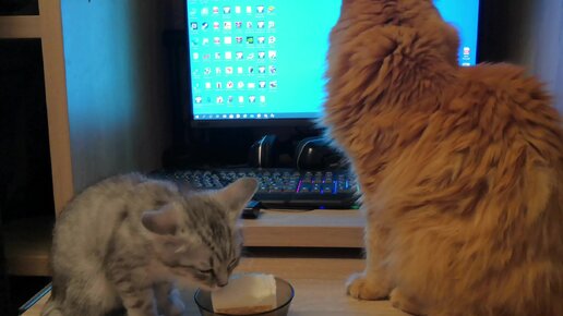 Маленький котенок облизывает мороженое, а взрослый кот морду отворачивает