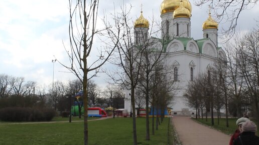 Православный храм на Соборной площади в Пушкине и детский развлекательный городок.