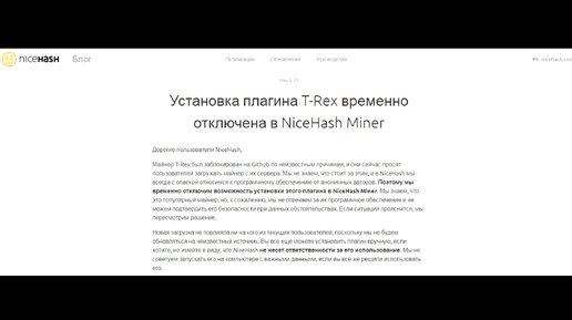 Установка плагина T-Rex временно отключена в NiceHash Miner