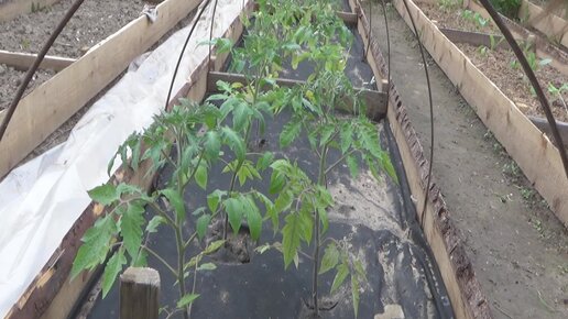 Высадка томатов в открытый грунт на черный спанбонд. Необычная подвязка помидоров на грядке в грунте