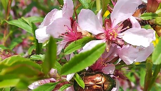 Бронзовка забавно меняет цвет на красиво цветущем миндале степном