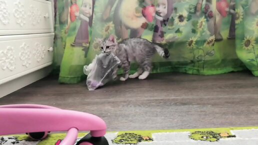 Маленькая кошечка утащила пакетик с грязными перчатками