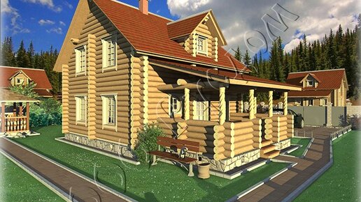 Деревянный полутороэтажный дом с большой рубленой верандой "Светлана"
