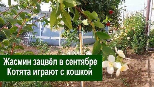 Жасмин зацвёл в сентябре. Кошка с котятами играет в саду