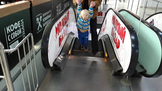 Папа и сын катаются на эскалаторе)