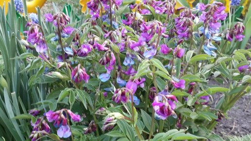 Дикий лесной горошек разросся на садовой клумбе