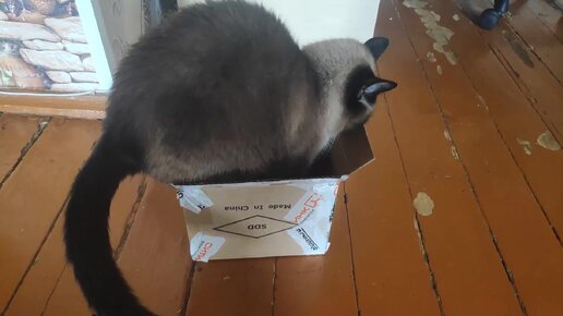 Дали коту маленькую коробку, а он пытается в неё залезть, он толстый и не залезет в неё