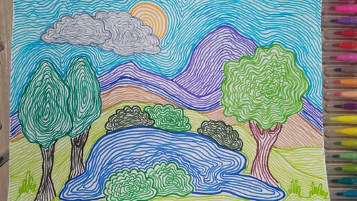 Рисунок линиями. Как нарисовать пейзаж фломастерами. Техника рисования