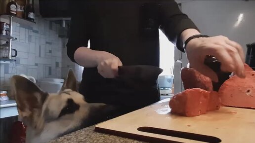 Кормление собаки. Легкое на завтрак в первый раз в жизни. Непонятно, будет ли есть
