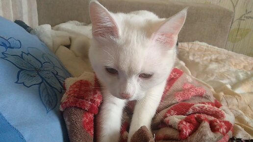 Кот хорошего настроения мнет лапками свой плед и урчит
