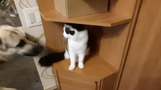 Пес гоняется за котом с игрушкой. Очень хочет отдать ее коту, но котяра не знает, как от нее отбиться