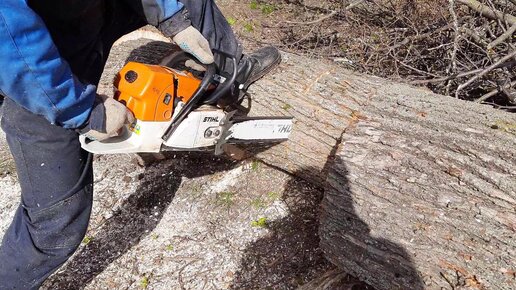 Залипательно пилит дерево на дрова бензопилой STIHL