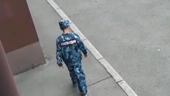 Маленький росгвардеец патрулирует двор в Калининграде