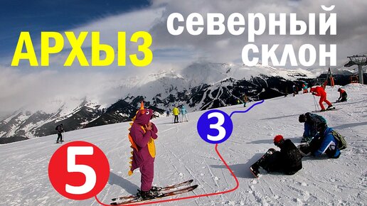 Архыз горнолыжный курорт. Спуск на горных лыжах красная 5 трасса, синяя 3 трасса. Северный склон. Станция северное сияние.