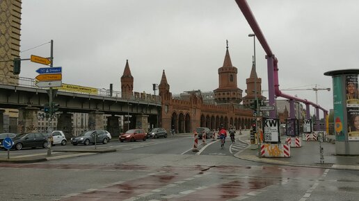 Розовые трубы Берлина на фоне моста Обербаумбрюке
