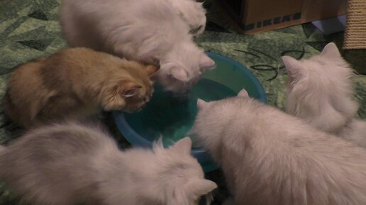 Котята, тазик с водой и рыбка