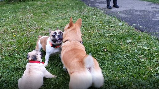 Смотрите как отважный щенок мопса играет с взрослыми собаками