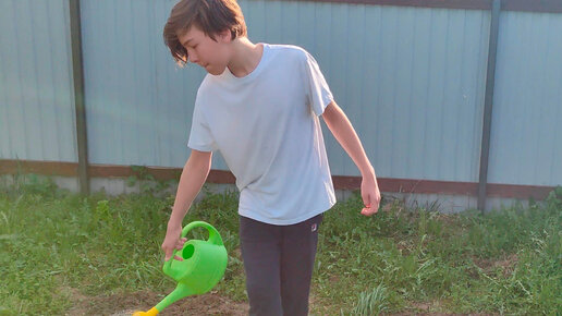 Мальчик копает грядку на даче