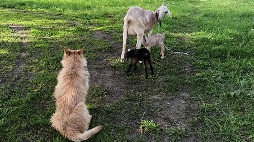 В козьем семействе прибыло. Собака знакомиться с козлятами. Земляные ванны для коз. Показываю
