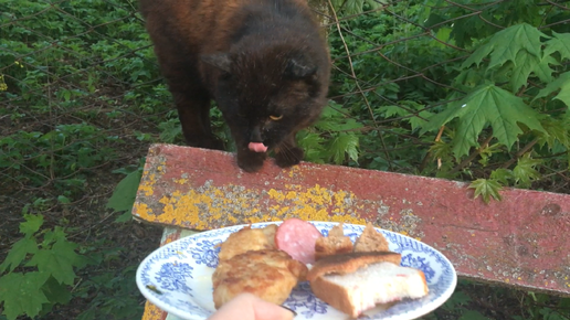 Очень жадный Джек рассел отнимает котлеты у голодного котика.