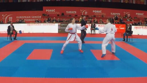 Бой на чемпионате Европы по каратэ. Русская спортсменка в сухую победила спортсменку из Польши.