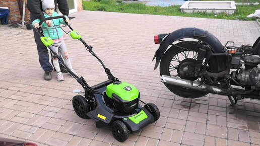 Купили самоходную газонокосилку Greenworks GD40LM46SP. Первые впечатления от этом "чуде"-управляла даже наша 4х летняя дочка