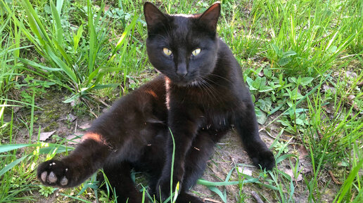 Наш чёрный приёмыш котёнок Черныш резвится на участке, да так, что потом еле отмываем питомца.
