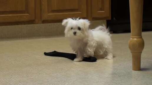 Смешной маленький щеночек мальтезе играет с хозяйским носком