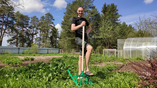 Копаю грядки, не напрягая спины. Гораздо быстрее, чем раньше получается. Показываю, как работает моя новая лопата