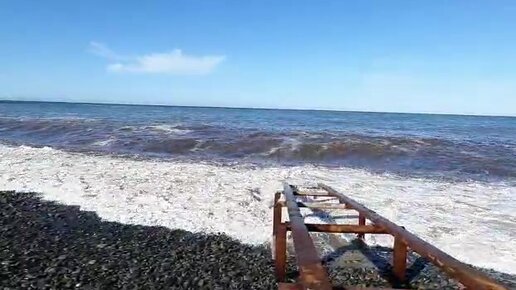 Море плещет сине-белую волну на пологий берег