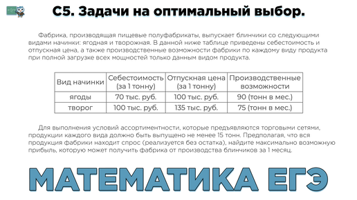 Математика ЕГЭ. C5. Финансовая математика. Задачи на оптимальный выбор. Производственные мощности