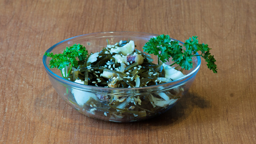 Делаем салат из морской капусты с морепродуктами и перепелиными яйцами